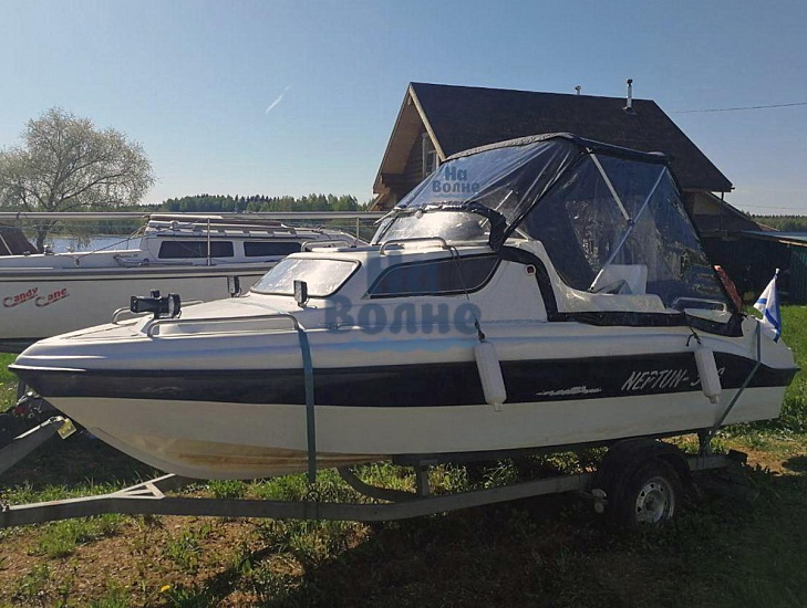 Тент с задней дверью для выхода к мотору, небольшими боковыми окнами и усиленными краями для установки застёжек. Изготовлен из специализированной тентовой ткани Оксфорд 600 повышенной плотности